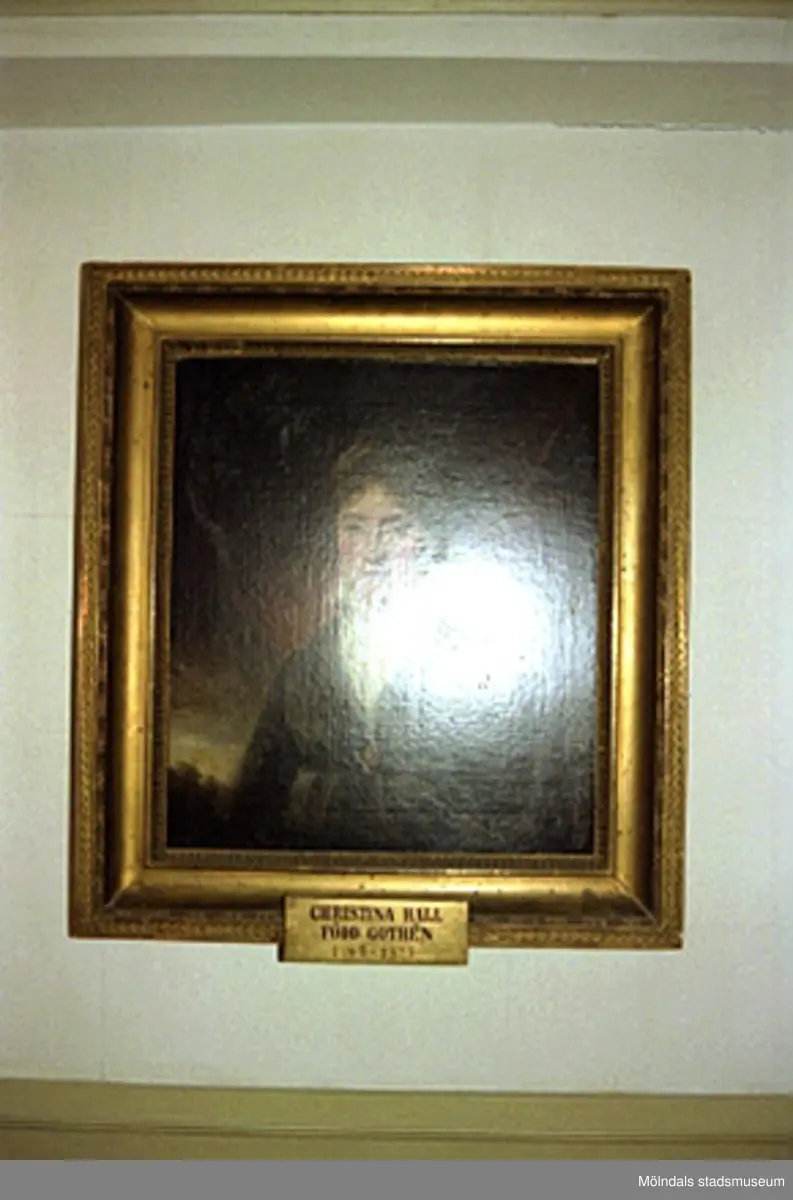 Utställning på Gunnebo slott, okänt årtal. Avfotograferad porträttmålning av Christina Hall (född Gothén). John Halls eller Carlsbergs teckningar.