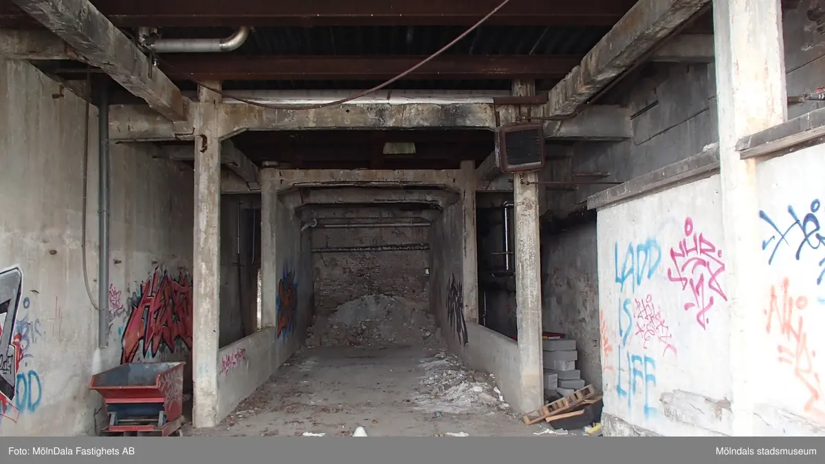 Lastficka i den norra fasaden till byggnad 25 på Forsåkersområdet i Mölndal. Byggnaden tillhörde tidigare bland annat pappersbruket Papyrus. Fotografi taget i juni 2018. Byggnadsdokumentation inför rivning.