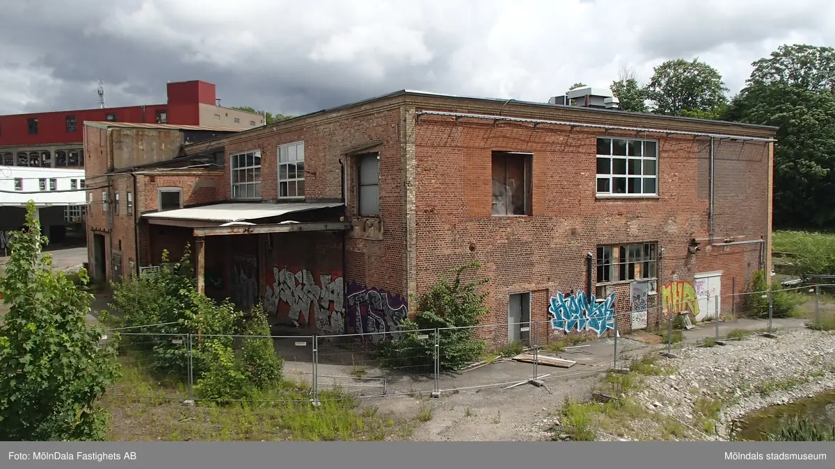 Byggnad 25 och 26 med omgivande byggnader på Forsåkersområdet i Mölndal. Fasader mot norr och mot väster. Byggnaderna tillhörde tidigare bland annat pappersbruket Papyrus. Fotografi taget i juni 2018. Byggnadsdokumentation inför rivning.