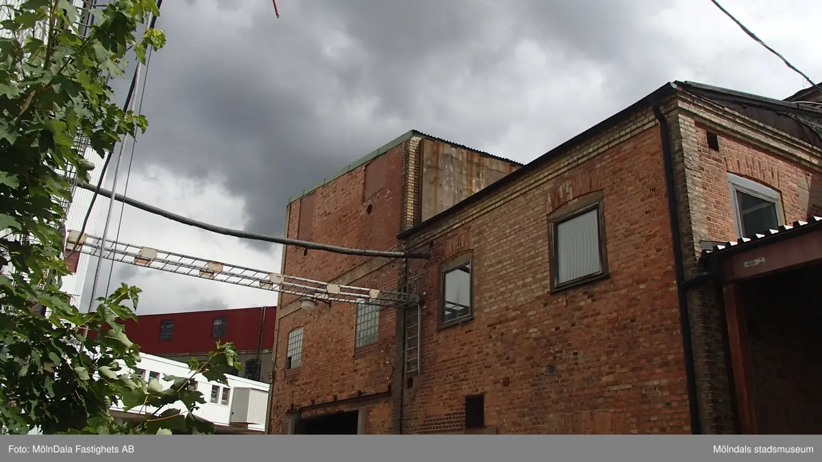 Byggnad 25 och 26 med omgivande byggnader på Forsåkersområdet i Mölndal. Fasader mot norr. Byggnaderna tillhörde tidigare bland annat pappersbruket Papyrus. Fotografi taget i juni 2018. Byggnadsdokumentation inför rivning.