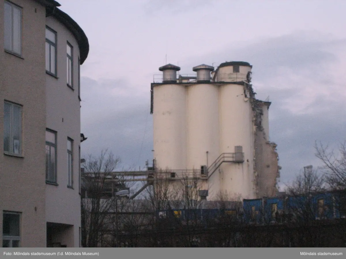 Vy över "Kråkan" från byggnaden "Strumpan" mot Soabs silo som är under rivning. Fotografi taget den 4 december 2008 i Mölndals Kvarnby. Byggnadsdokumentation under rivning.