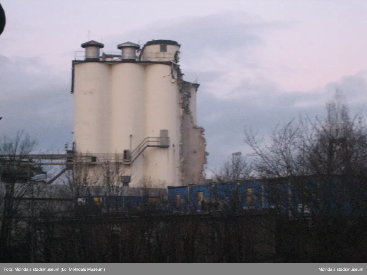 Vy över "Kråkan" från byggnaden "Strumpan" mot Soabs silo som är under rivning. Fotografi taget den 4 december 2008 i Mölndals Kvarnby. Byggnadsdokumentation under rivning.