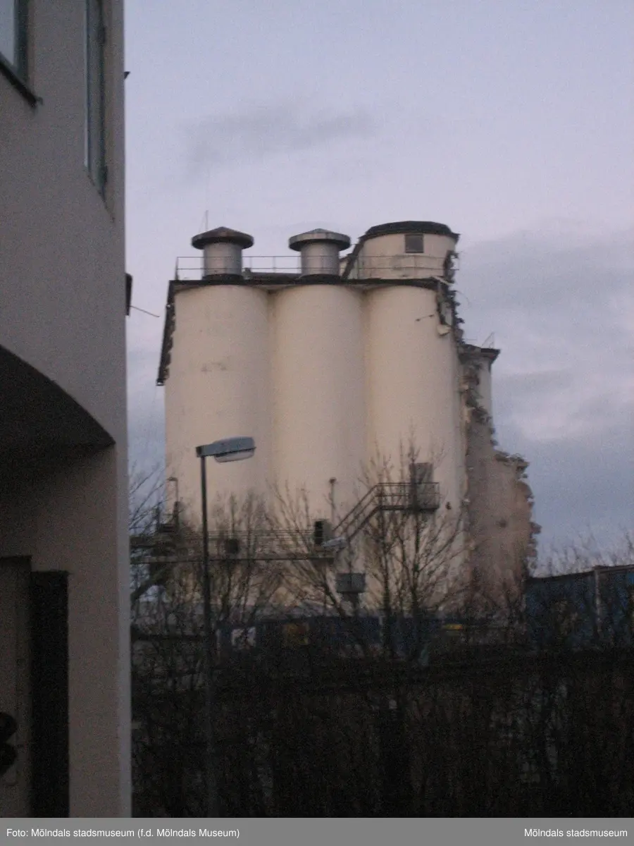 Vy över "Kråkan" från byggnaden "Strumpan" mot Soabs silo som är under rivning. Fotografi taget den 4 december 2008 i Mölndals Kvarnby. Byggnadsdokumentation under rivning.