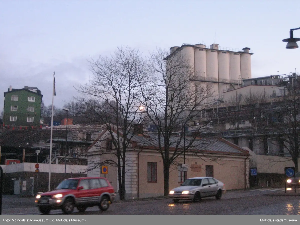 Rivningen av Soabs silo i Mölndals Kvarnby. Vy från Gamla Torget. I förgrunden ses även Götiska Förbundets friskola. Fotografi taget den 4 december 2008. Byggnadsdokumentation under rivning.