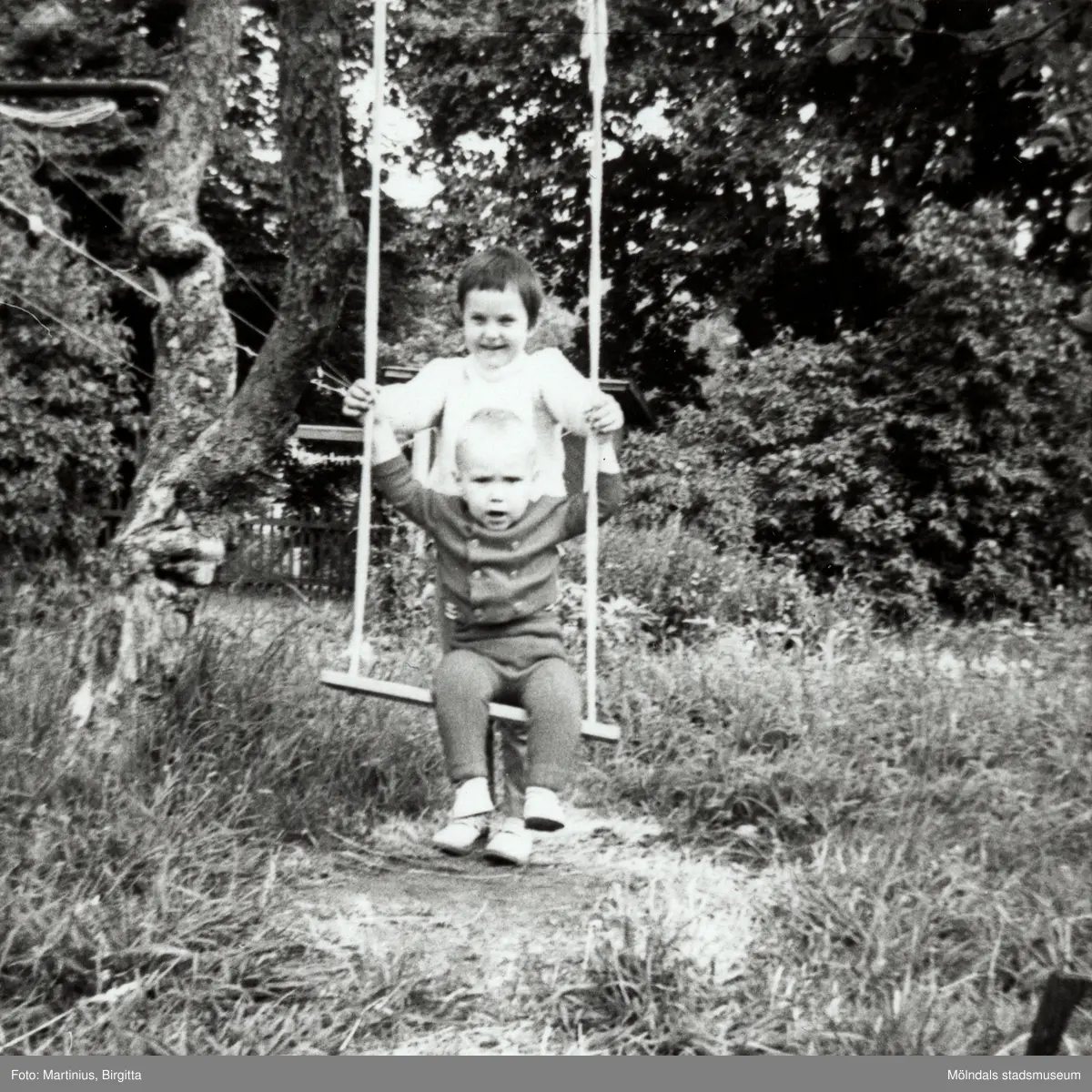 Storasyster Ilse Tobiasson (född 1960, gift Glimberg) gungar lillebror Lars-Åke Jansson (född 1964, gift Dahlén), i Högsbo år 1965. Lars-Åkes farmor Maj hyrde en sommarstuga uppe på berget, väster om Dag Hammarskjöldsleden, mittemot Slottsskogsvallen.
