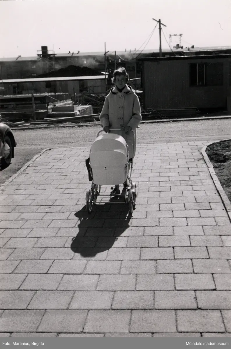 Bågskyttegatan vid Jungfruplatsen år 1960. Ninnie Tobiasson (född Johansson 1937) promenerar med nyfödda dottern Ilse (född 1960, gift Glimberg) liggandes i barnvagnen. I bakgrunden ses Bågskyttegatans jämna nummer som då var under uppbyggnad. Familjen bodde på Bågskyttegatan 3G (ojämnt nummer) vilket var redan inflyttat och klart.