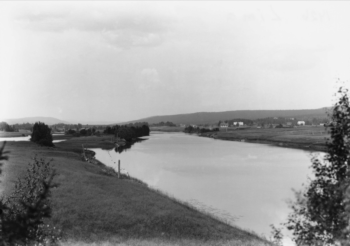 Norra delen av Risätra by, taget från västra sidan av älven, I förgrunden gamla skolan (nedre) samt lärarbostaden. Renströms affär (diversehandel) vita huset till höger