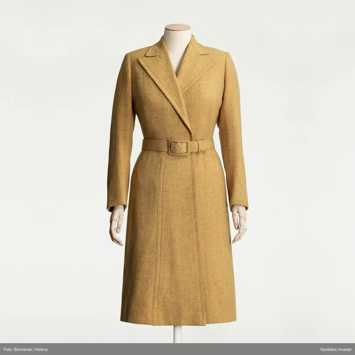 Uniformsinfluerad yllekappa i tidstypiskt snitt med uppbyggda axlar. Beställd från NK:s Franska damskrädderi av Astrid Lamby född Trana (1898-1990). Levererad mars 1944.