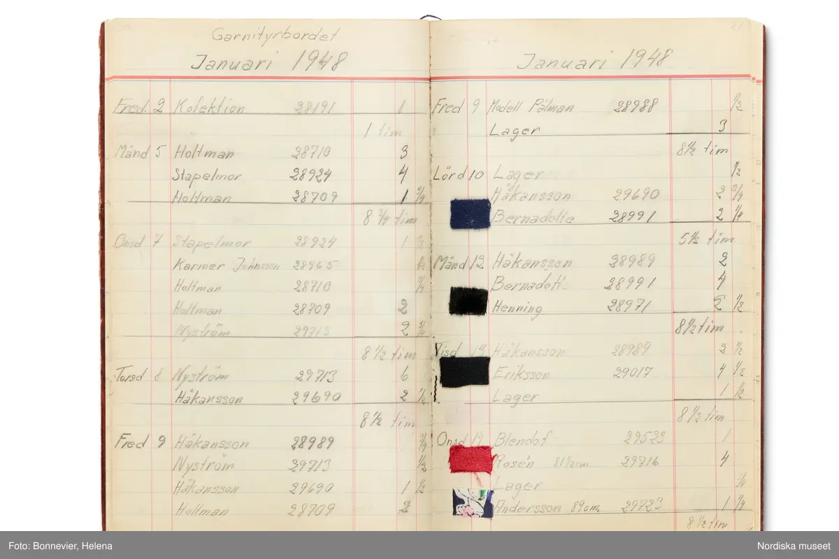 Tidbok som sträcker sig från 1947 till 1956, har tillhört sömmerskan Maj-Britt Hemlin Karlsson på NK:s Franska damskrädderi. Här kan utläsas kundernas namn, arbetstimmar samt materialangivelser.