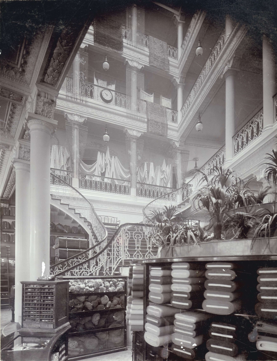 Huvudhallen i Nordiska Kompaniet vid Stureplan i Stockholm. En trappa upp ligger Franska damskrädderiet.