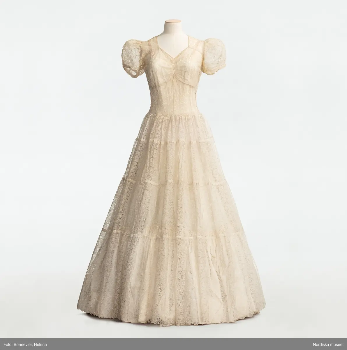 Romantisk aftonklänning av silkesspets. Puffärmar och underklänning med vid volang nedtill som håller ut kjolen. Tidstypisk inspiration från Hollywoods kostymfilmer. Beställd från NK:s Franska damskrädderi av Elsa af Trolle (1886-1953) författare, journalist och översättare. Levererad ca 1939.