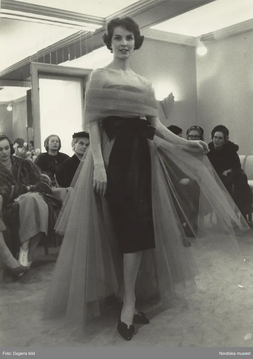 Modevisning på NK:s Franska damskrädderi, säsongens kollektion våren 1958. Mannekäng i mörk klänning med rosett framtill och tyll över axelpartiet och kjolen. Åskådare sitter på stolar.