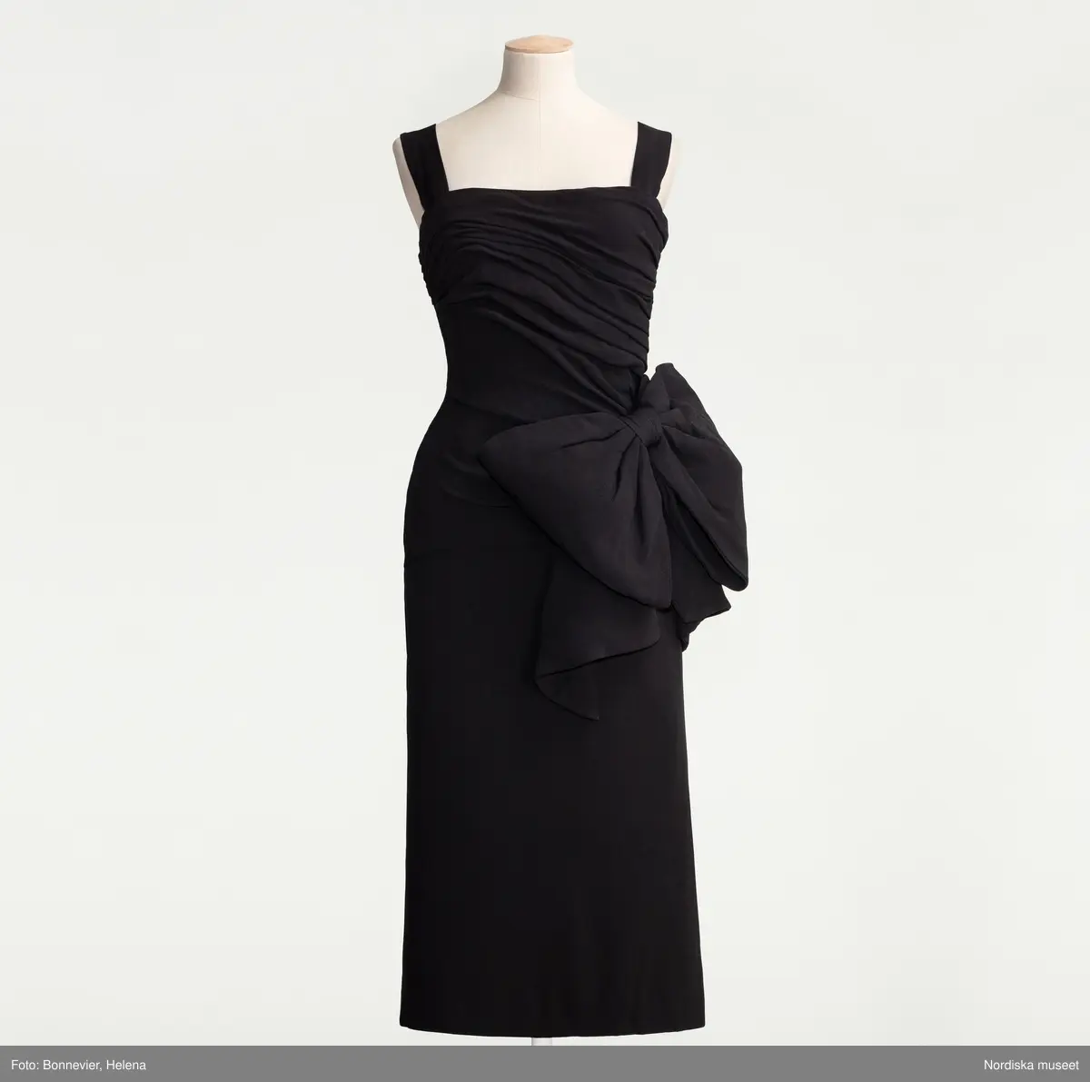 Klänning monterad på docka. Svart klänning, cocktailklfodral, med axelband, assymetrisk drapering och rosett på höften, efter Jacques Fath. Beställd från NK:s Franska damskrädderi av Gunnel Swedrup född Hederström (1917-2005). Levererad våren 1955.