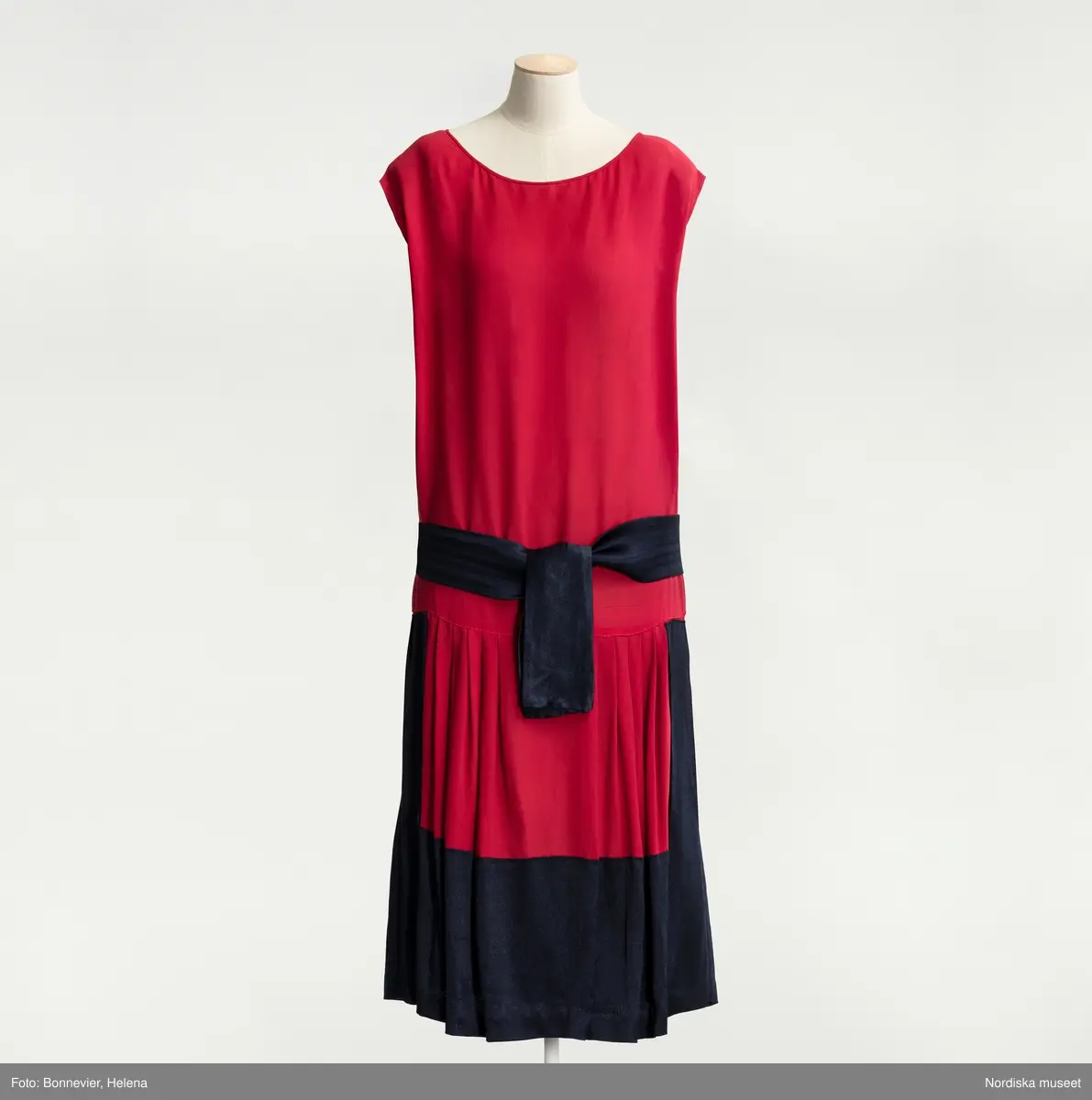 Klänning, monterad på docka, av rött konstsiden och svart satäng med brett knytskärp i samma material. Tidstypisk kort, rak klänning, möjligen efter en modell av Paul Poiret. Beställd från NK:s Franska damskrädderi av Anna Beer född Lundgren (1892-1963), levererad 1925.