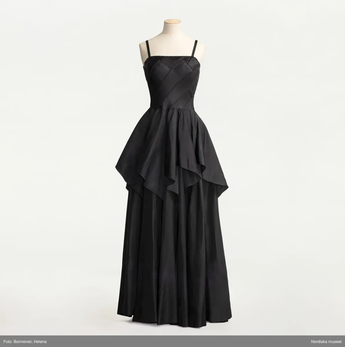 Klänning av svart sidenrips med diagonalskuret liv och cirkelskuren kjol, troligen ett modellplagg. Köpt från NK:s Franska damskrädderi i slutet av säsongen av Eileen Moberg född Spencer (1904-1989) gift med John Anders Moberg, chef för modeavdelningarna på NK. Levererad 1940-tal.