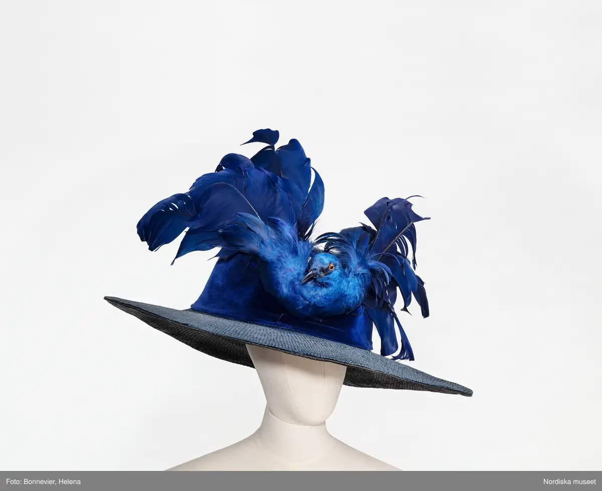 Blå hatt från NK:s Franska damskrädderi. Madame Suzannes vidbrättade kvarnhjulshatt av strå och sammet är dekorerad med en hel, infärgad fågel. Den är märkt med etiketten "Modes Suzanne, AB Nordiska Kompaniet Stockholm. Kunskapen om vem den magnifika kreationen skapades för har dock gått förlorad. Levererad ca 1908 - 1910.