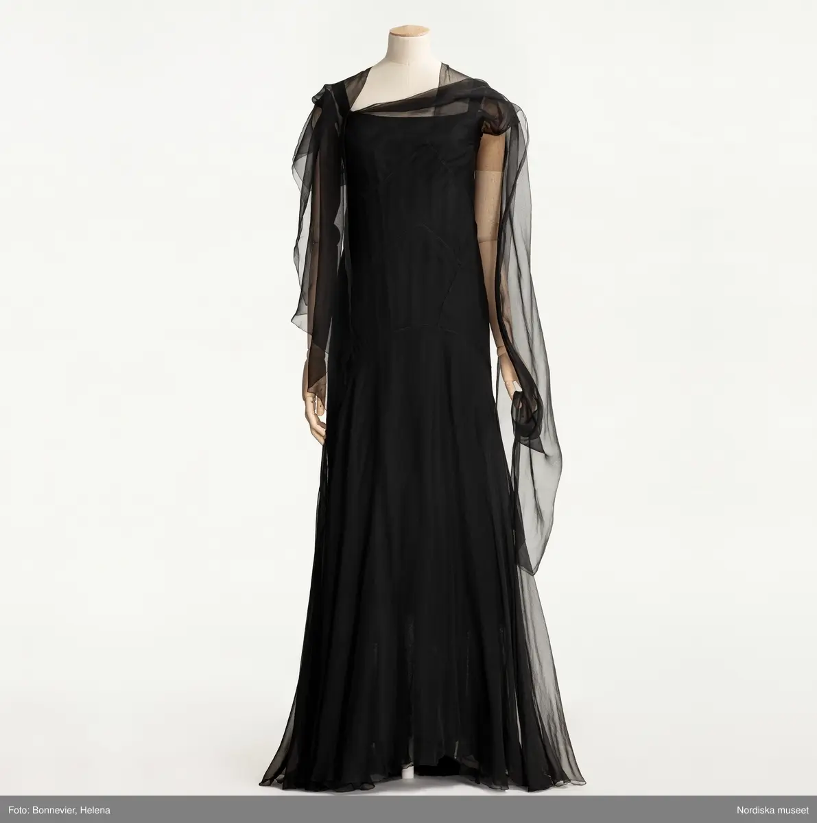 Klänning monterad på docka. Festklänning med detaljer av tyll. Originalplagg från Coco Chanel, troligen från tidigt 1930-tal. Den har tillhört Margit Graffman (1900-1991), chef för NK:s konfektionsavdelning 1931 till 1953.