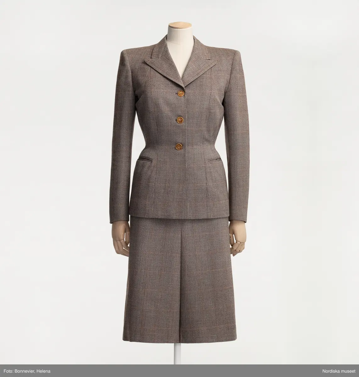 Promenaddräkt av ylle från NK:s Franska damskrädderi, möjligen efter brittisk förlaga. Glencheckrutig i brunt och vitt. Jackan enkelknäppt, figursydd med bålsömmar, herrslag och 2 fickor utan lock. Kjolen av 4 våder något sneddade, blixtlås i vänster sida. Beställd från NK:s Franska damskrädderi av journalisten Pia Hård af Segerstad född Holmgren (1909-2001). Levererad juni 1945.