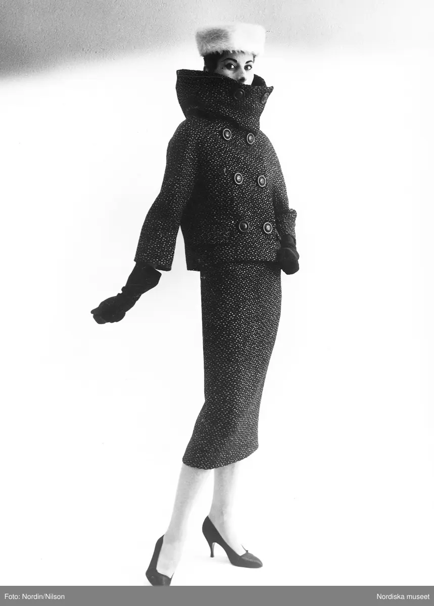 Mannekängen Erika Sundt i tweeddräkt med hög krage, skorstenskrage, handskar, pumps och vit pälshatt. Original från Hubert de Givenchy, NK:s Franska damskrädderi, hösten 1956.