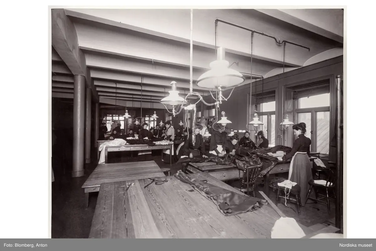 Interiör från Nordiska Kompaniets syateljé vid Stureplan, fyra trappor upp. Sömmerskor syr, skär till tyg och arbetar med olika moment vid avlånga träbord. Armaturer med glaskupor. I förgrunden ett tillskuret plagg. Redan 1902 fanns elektriska symaskiner i ateljén, elekrisk belysning installerades 1910.
