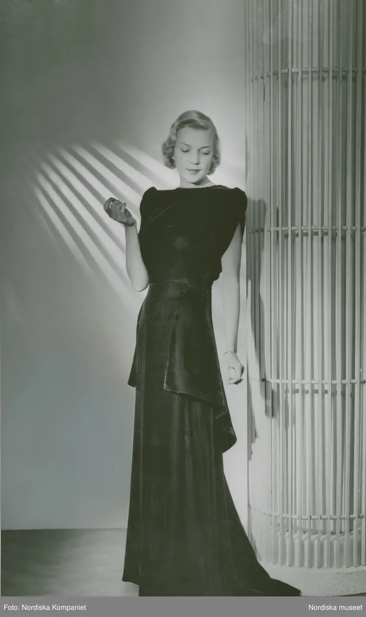 Mannekängen Margit Langlet visar aftonklänning från NK:s Franska damskrädderis egen ateljé.