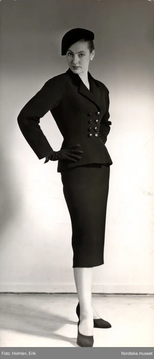 Modell iklädd svart dräkt från Balenciaga på NK:s Franska damskrädderi (Nordiska Kompaniet) i Stockholm, september 1951.