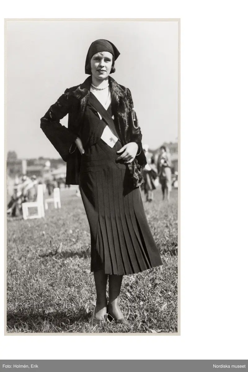 Mannekäng visar mode från NK:s Franska damskrädderi vid Ulriksdals galoppbana utanför Stockholm. Klänning med v-ringning och vadlång kjol med nedsydda veck. Höftlång jacka, liten hatt och kuvertväska under armen. I bakgrunden ses besökare.