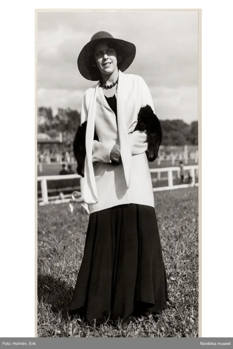 Mannekäng visar mode från NK:s Franska damskrädderi vid Ulriksdals galoppbana utanför Stockholm. Hellång klänning med vid kjol. Stusslång jacka med långa knytband vid kragen och pälsdekorerade ärmar. Hatt. I bakgrunden ses besökare.