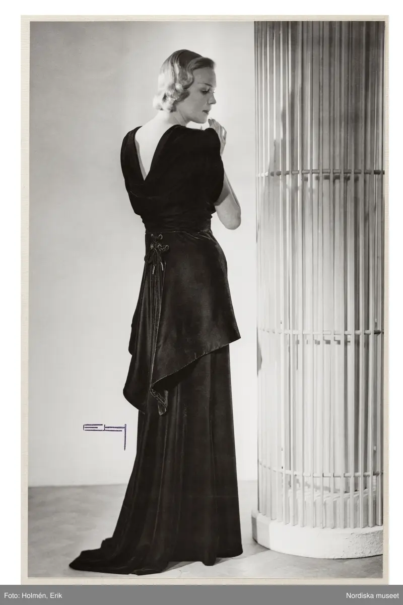 Mannekängen Margit Langlet poserar iklädd hellång, svart sammetsklänning med kort, draperad ärm och skört med snörning, sedd bakifrån. Från NK:s Franska damskrädderis egen ateljé. Klänningen framifrån se NMA.0099242.