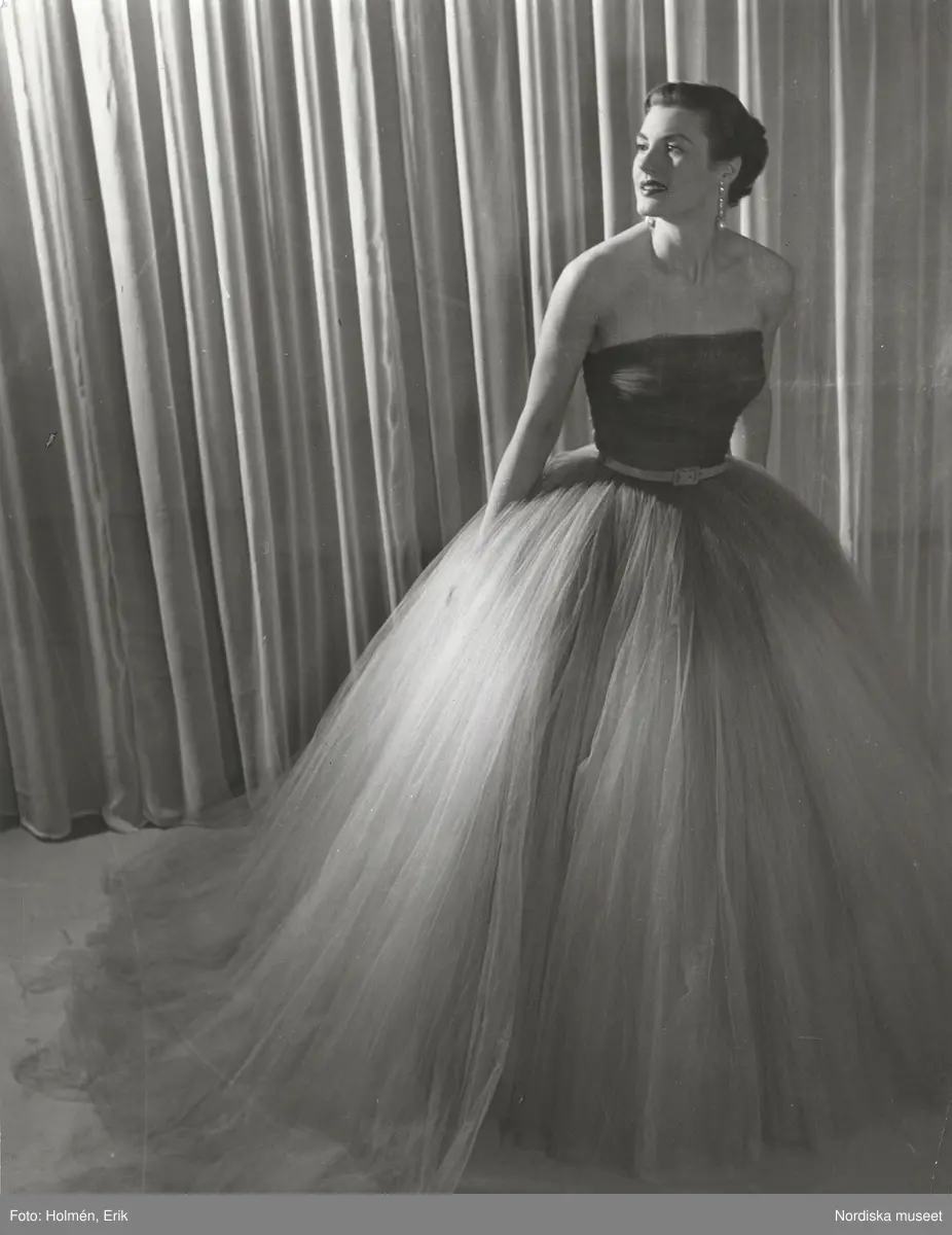 NK:s Franska damskrädderi. Kvinna i baraxlad aftonklänning med mörkt liv och ljus, vid tyllkjol. Text på baksidan: "J. Griffe mars 1950"