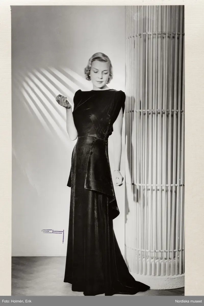 Mannekängen Margit Langlet poserar iklädd hellång, svart sammetsklänning med kort, draperad ärm och skört, sedd framifrån. Från NK:s Franska damskrädderis egen ateljé. Klänningen bakifrån se NMA.0099258.