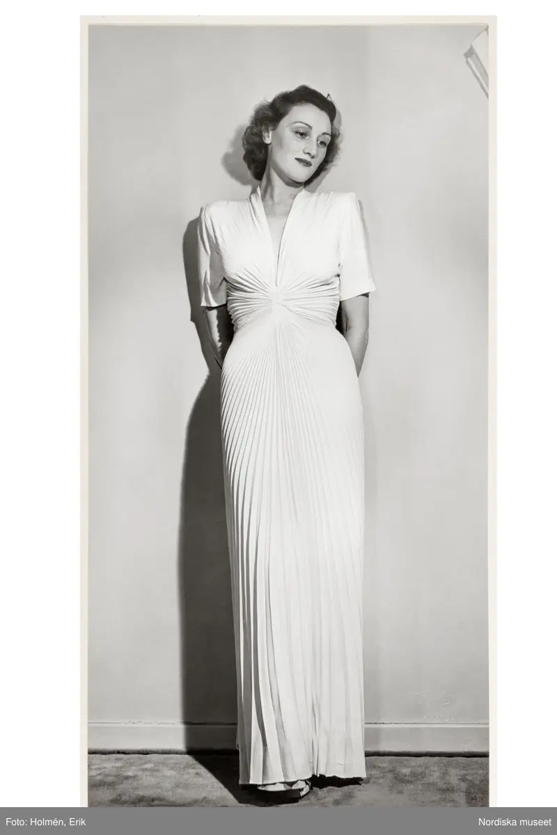 Mannekäng visar festplagg på NK:s Franska damskrädderi. Klänning med v-ringning, kort ärm och markerade axlar. Livet rynkat mot midjan. Hellång, finplisserad kjol.