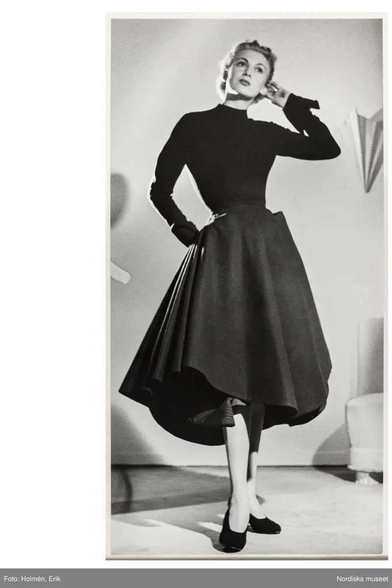 Mannekäng visar figurnära överdel med lång ärm, nedåt avsmalnande med uppvikt manschett, liten polokrage. Markerad midja, vadlång kjol med mycket vidd och stora utanpåfickor. Original från Christian Dior, NK:s Franska damskrädderi, hösten 1948.
