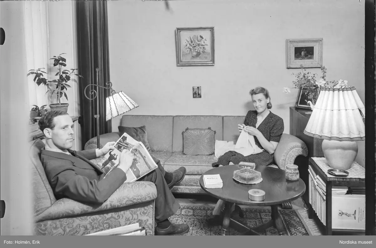 Interiör, man och kvinna i soffgrupp ”Sjöberg (oläsligt)”
