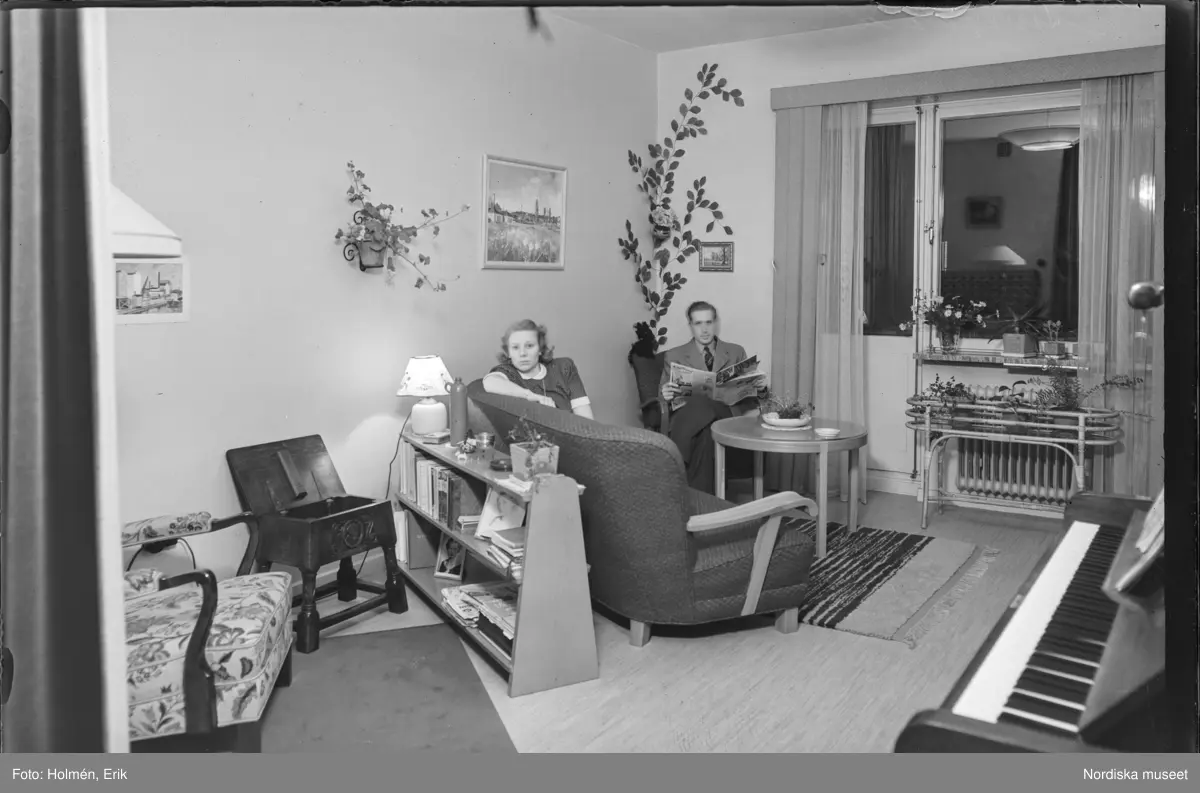 Interiör, man och kvinna i soffgrupp ”Sivegård”