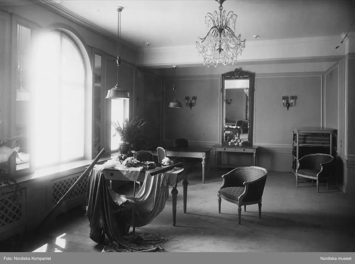 Interiör från Franska damskrädderiet på Nordiska Kompaniet, våningsplan fem. Rummet är elegant möblerat med stilmöbler och en stor spegel med förgylld ram. Till vänster i bild ett stort fönster med välvd överdel, där solen strålar in. På ett bord ligger provbitar av textil och ett tygsjok ligger draperat över en stol. 1925-1929.