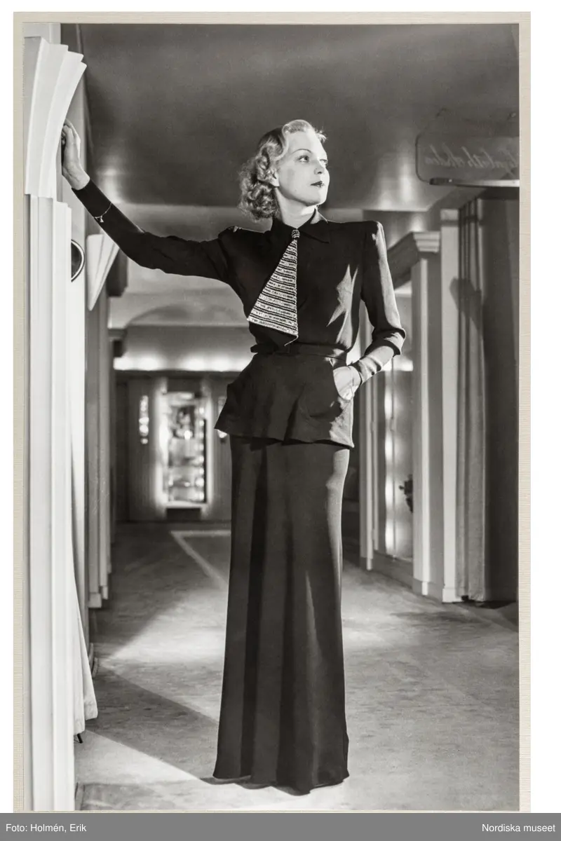 Mannekängen Margit Langlet visar plagg i salongen på NK:s Franska damskrädderi, med klassicistisk dekor. Klänning med skjortblusliv medmarkerade axlar, lång smal ärm och skärp i midjan. I halsen en mönstrad kravatt. Hellång, smal kjol.