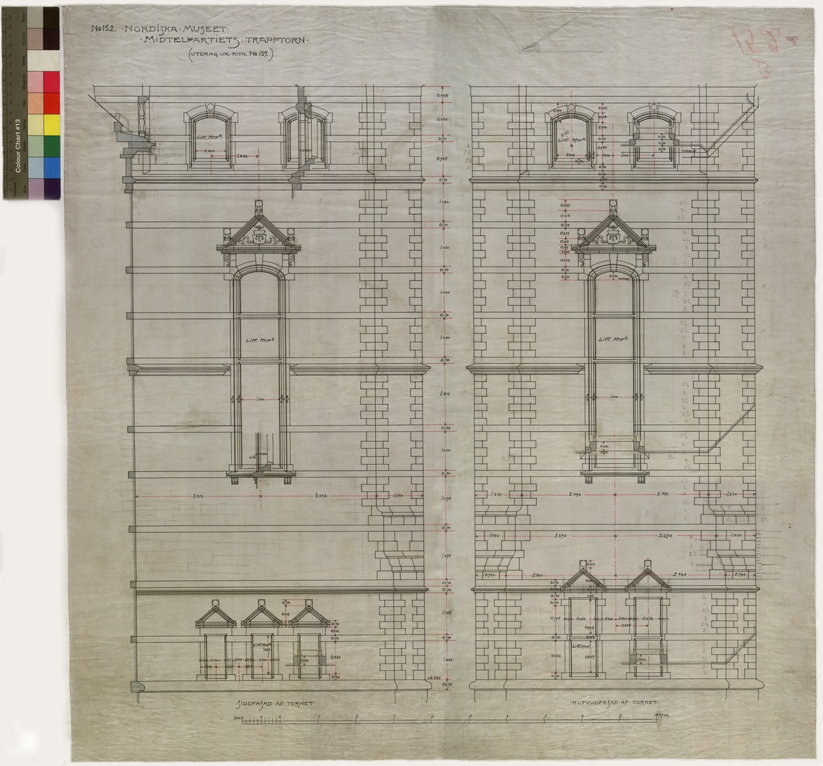 No 152 Nordiska Museet. Midtelpartiets trapptorn (Utdrag ur ritn 159) Sidofasad af tornet Hufvudfasad af tornet