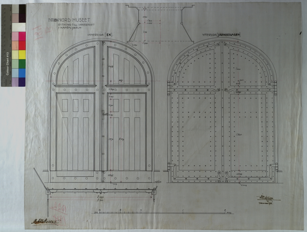 No 184. Nordiska Museet. Ritning till innerport i kaféflygeln. Yttersida {järnbeslagen] Innersida [ek].