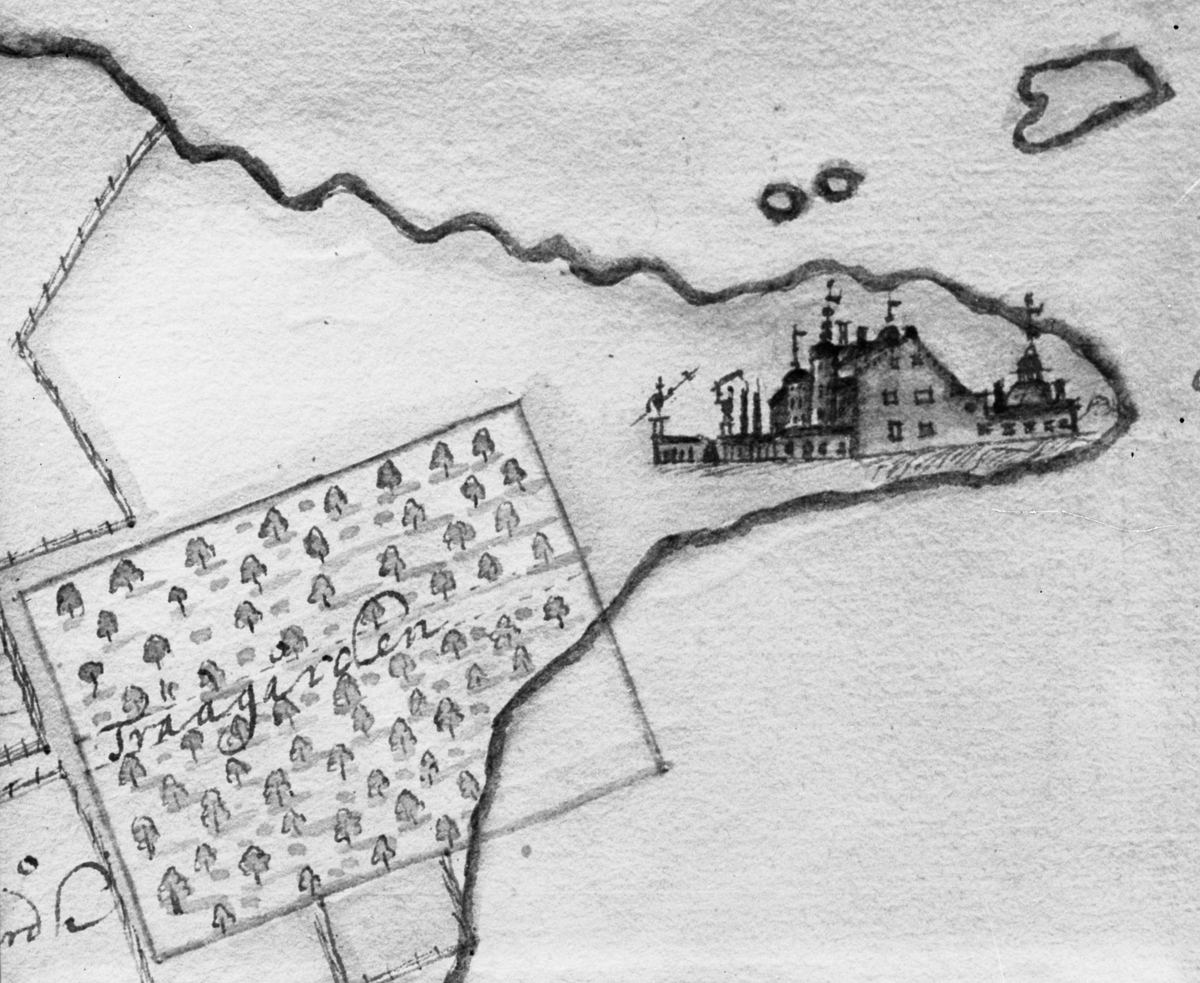 Karta över Tullgarn slott med omgivning "ACCURATA DELINEATIO GEOMETRIA öfwer Tullegarns Sätegårds Enskijlta ägor .....belägne uthi Hölbo Härad och Hölöö Sockn. Förfärdigat anno 1685 af Erich Agner".