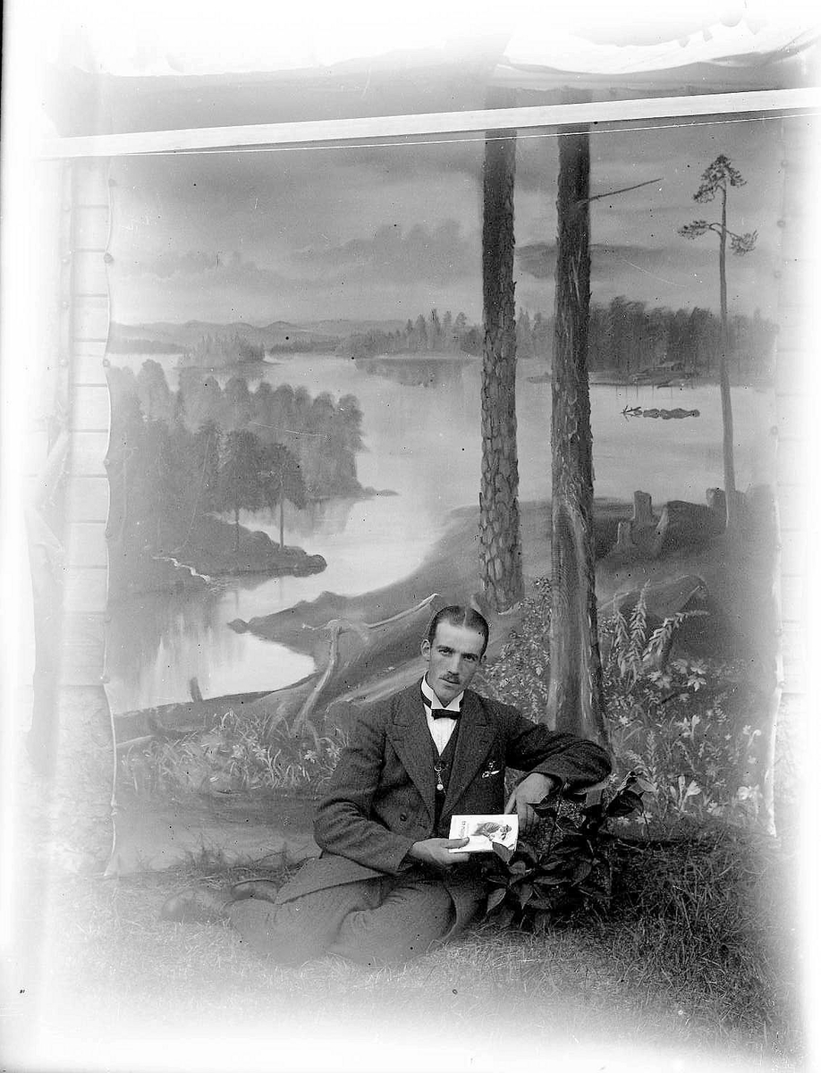 Porträtt, angett som sjävporträtt av Georg Renström, sittande framför en uppspikad fotofond föreställande ett landskap med utsikt. Samma fotofond finns på flera av fotografens bilder. Se rubriken Referenser, relaterade objekt.