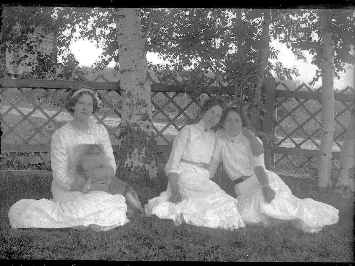Tre unga kvinnor sittande på en gräsmatta. Lima, Dalarna.