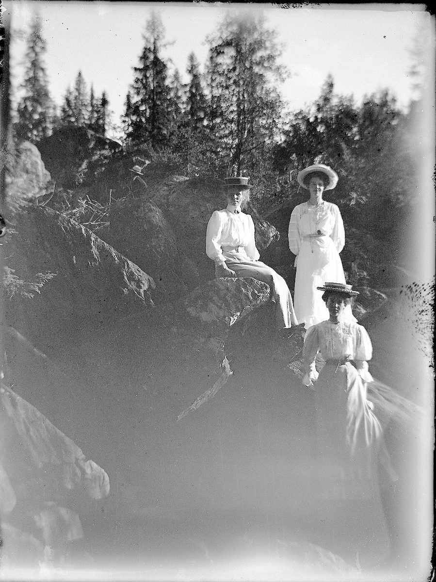 Bild av tre kvinnor på en klippa. Lima, Dalarna.