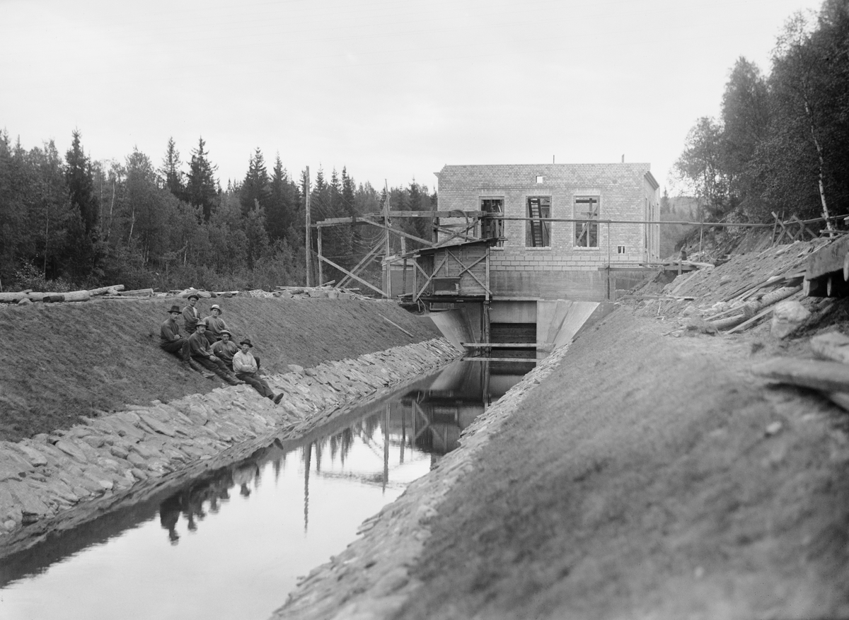 Kraftstationsbygget vid Ärån. Några arbetare vilar vid åkanten.
