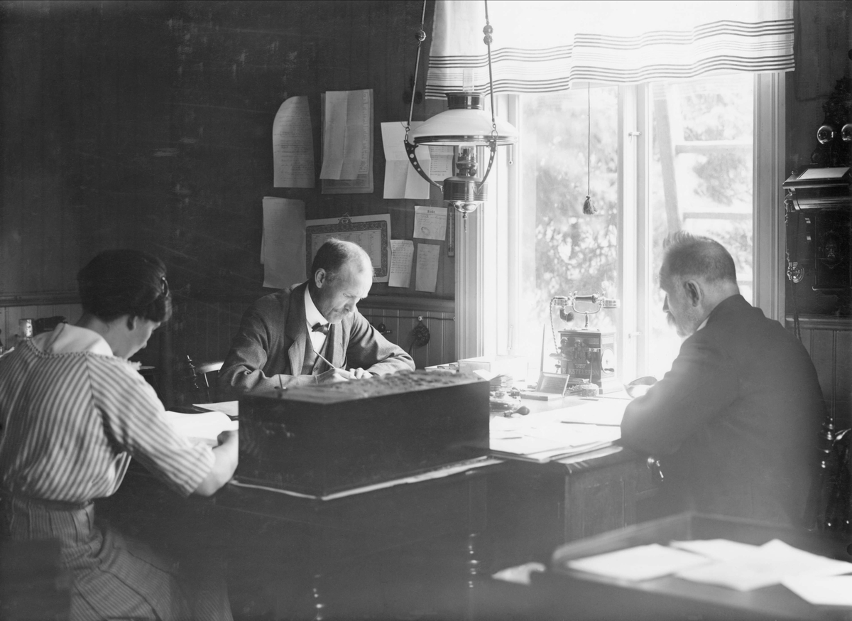 Handelsbanken i Limedsforsen. Kamrer S. O. Olsson, kontorist Hedvig Renström, sockenskrivaren o kommunalmannen Lissola Martin Persson