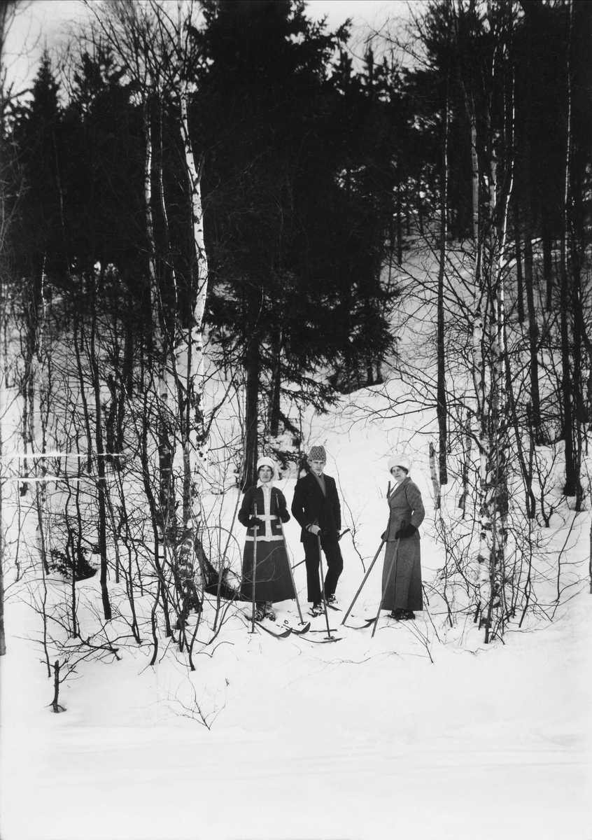 Systrarna Renström på skidtur med kavaljer. Ellen och Hedvig