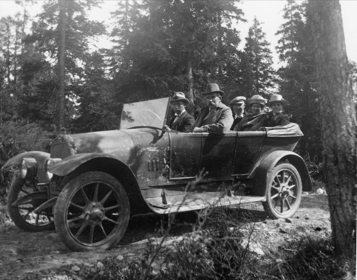 Titel: Handl. Erik Renström med fru, dotter och måg på biltur med chaufför Karl Johan Karlsson