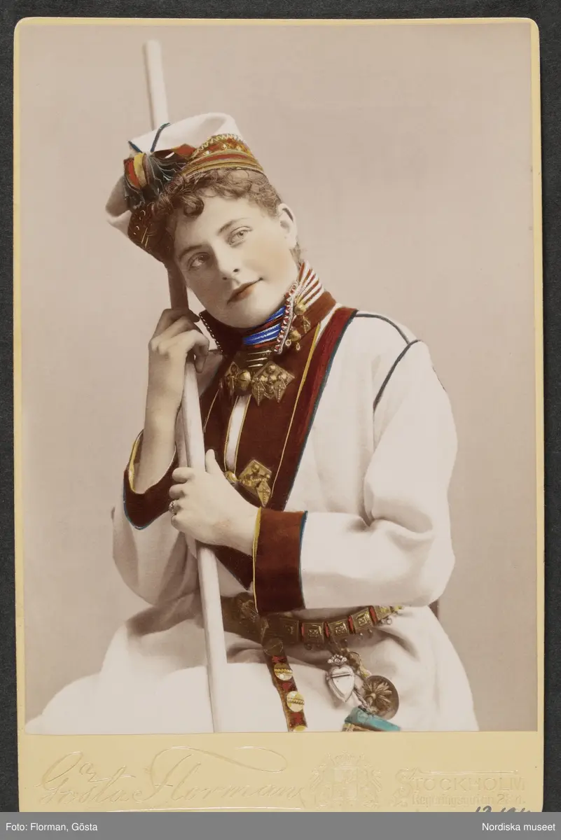 Kabinettsfoto taget av fotograf Gösta Florman. Poserande kvinna i ev samedräkt.