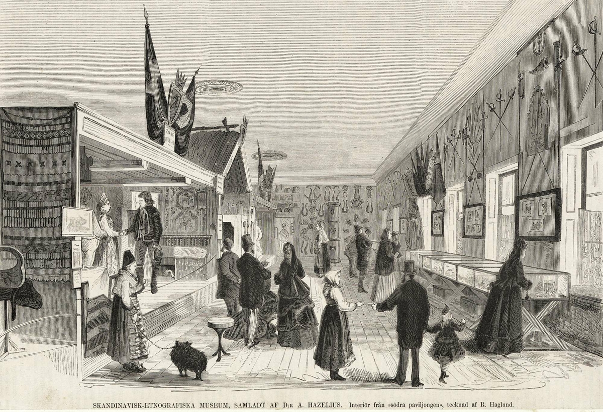 Interiör från Södra paviljongen tecknat av H. Haglund, Skandinaviskt-Etnografiska museum samlat av Dr. A. Hazelius. Ur Ny Illustrerad Tidskrift 1875, s. 12.