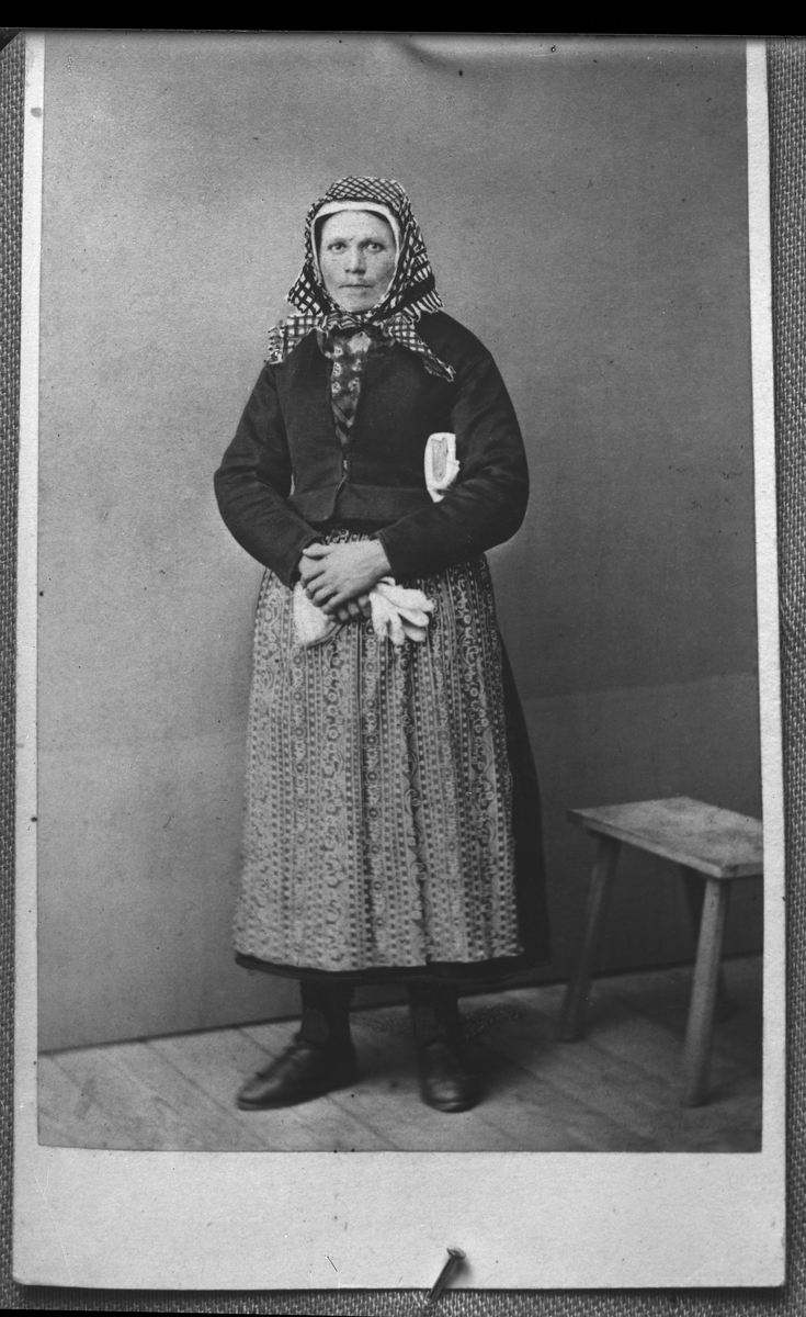 Ateljéporträtt av kvinna i helfigur, stående iklädd mörk tröja, brokigt förkläde och rutig huvudduk.